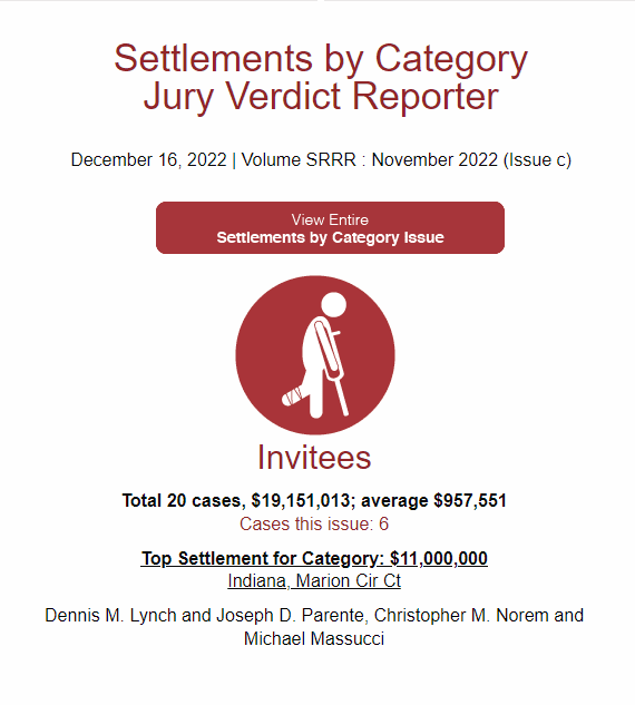 The Law Offices of Parente & Norem, P.C. is proud to congratulate Christopher M. Norem, Dennis M. Lynch, and Joseph D. Parente for achieving the highest settlement in the $11M category as published in the December 2022 edition of Jury Verdict Reporter. Way to go, team!