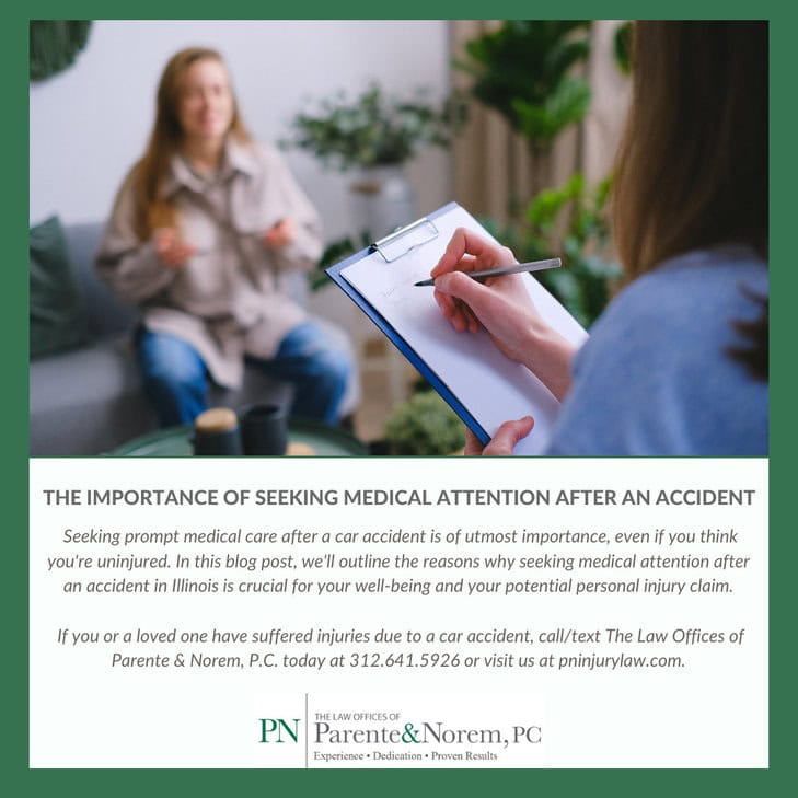 Remember, your health and well-being are paramount, and seeking medical attention after an accident is the first step towards healing and regaining control over your life. Always consult with a personal injury attorney to understand your rights and options fully and to navigate the complex legal process effectively. If you or a loved one have been injured in an accident, call/text The Law Offices of Parente & Norem, P.C. today to speak with one of our experienced attorneys today at 312.641.5926, or fill out a contact form here on our website.
