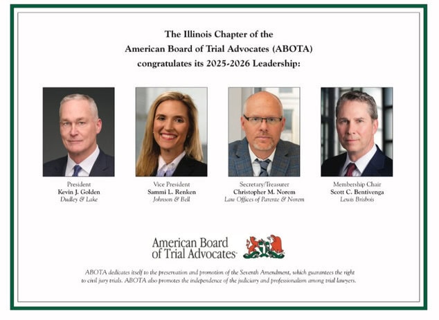 The Law Offices of Parente & Norem, P.C. would like to congratulate Christopher Norem on joining the leadership of the Illinois Chapter of the American Board of Trial Advocates (ABOTA) as their Secretary/Treasurer.