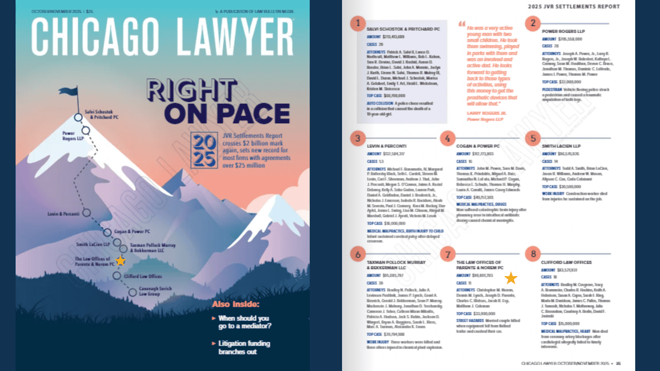 The Law Offices of Parente & Norem has once again secured its position among the most successful plaintiff firms in Illinois, earning the #7 ranking in the 2025 Jury Verdict Reporter (JVR) Settlement Report, as published in Chicago Lawyer magazine this month. The annual report ranks firms based on settlements of $500,000 or more, with 132 firms statewide making this year’s list.