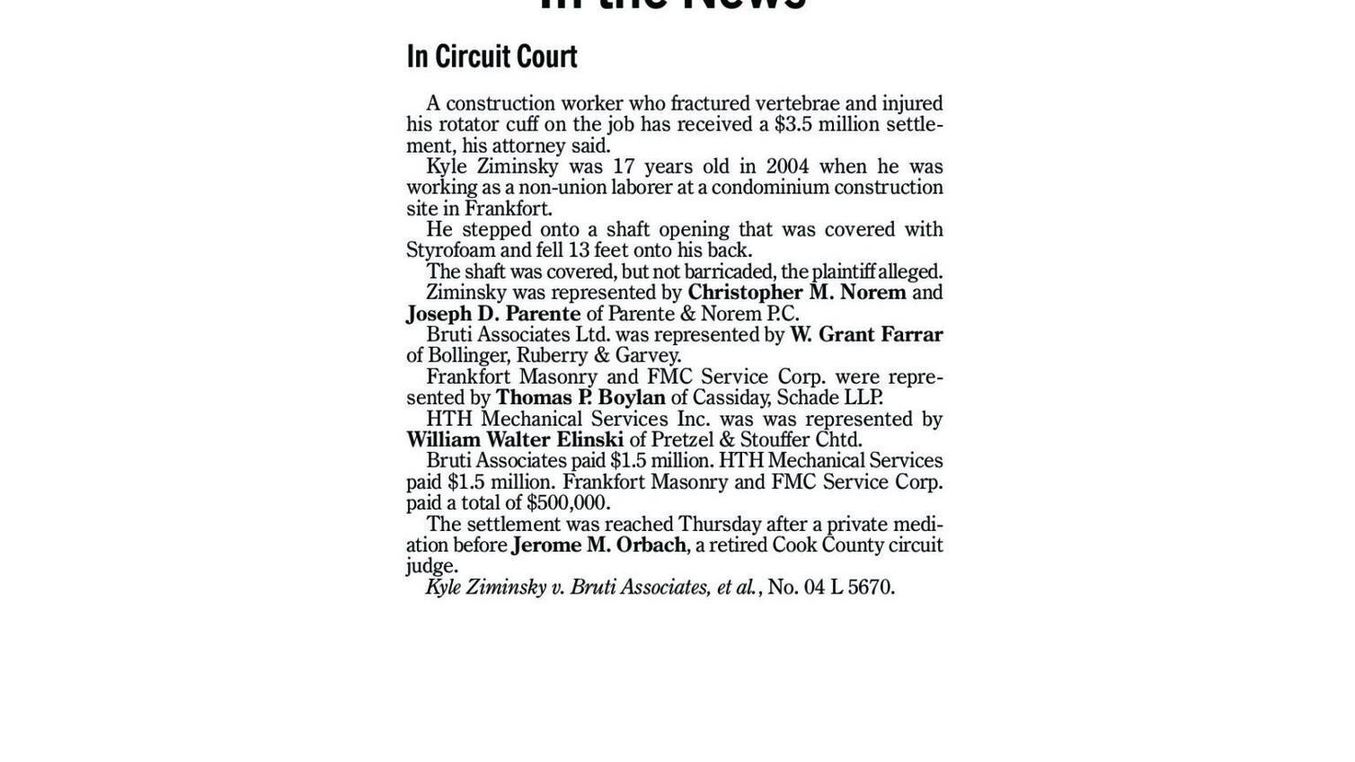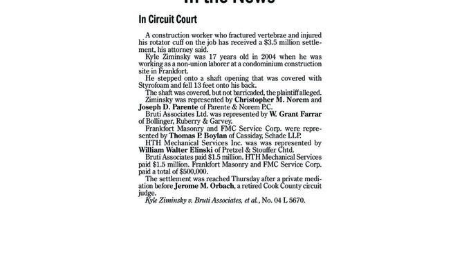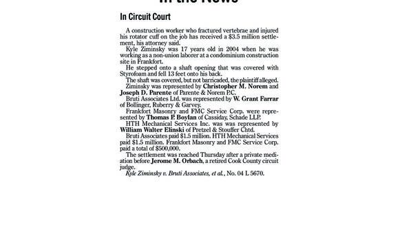 Chicago Daily Law Bulletin // In Circuit Court A construction worker who fractured vertebrae and injured his rotator cuff on the job has received a $3.5 million settle- ment, his attorney…