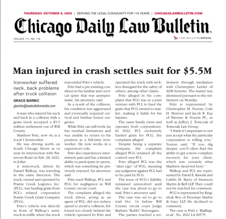 The Law Offices of Parente & Norem has once again secured its position among the most successful plaintiff firms in Illinois, earning the #7 ranking in the 2025 Jury Verdict Reporter (JVR) Settlement Report, as published in Chicago Lawyer magazine this month. The annual report ranks firms based on settlements of $500,000 or more, […]
