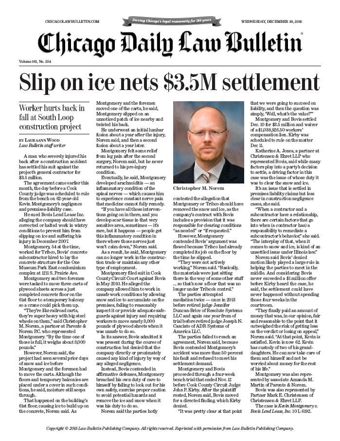Slip on Ice Nets $3.5M settlement BY LAURAANN WOOD Law Bulletin staff writer A man who severely injured his back after a construction accident has settled his suit against the project’s general contractor for $3.5 ... Read More > June 25, 2022