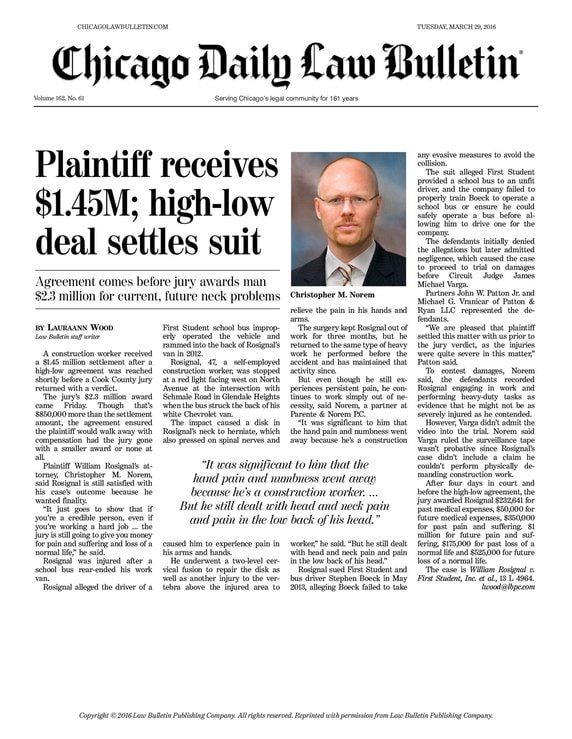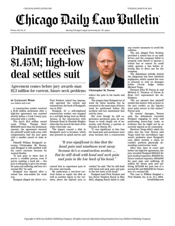 Plaintiff Receives $1.45M; High-Low Deal Settles Suit BY LAURAANN WOOD Law Bulletin staff writer A construction worker received a $1.45 million settlement after a high-low agreement was reached shortly before a Cook County jury return... Read More > June 25, 2022