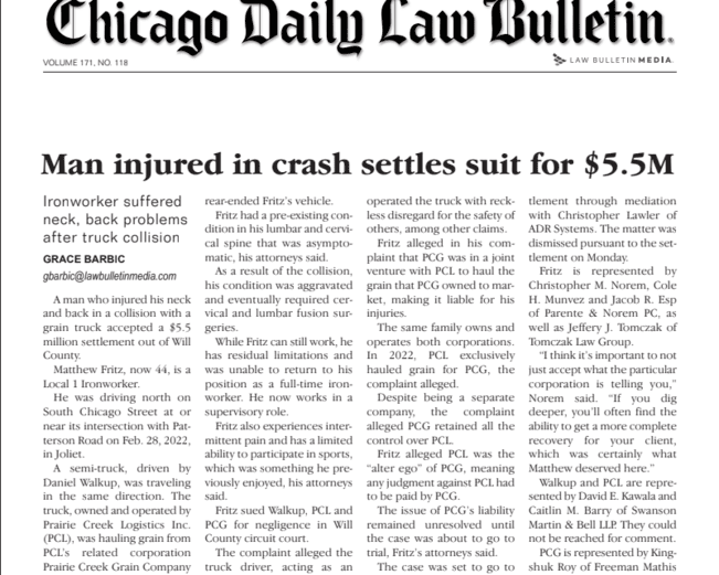 The Law Offices of Parente & Norem recently secured a $5.5 million settlement for a 44-year-old ironworker who was badly hurt in a collision with a grain truck in…